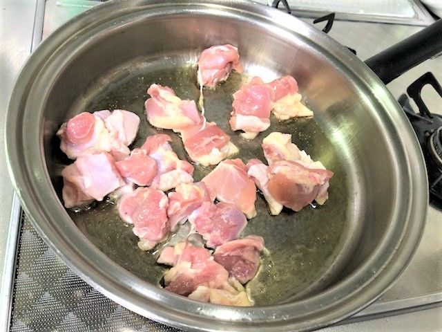 フライパンにごま油を入れて鳥肉炒めて・・・