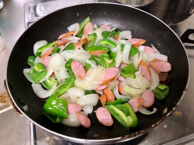 具材(玉ねぎ・ピーマン・ウインナー)を炒めて