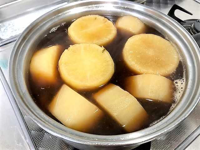 米ぬかを落として「煮汁」で煮て味をしみこませて