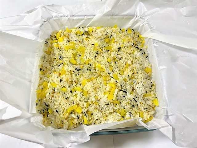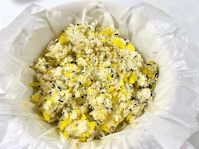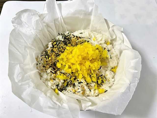 「ごはん」2合に「のりたま」&「きざみたくあん」混ぜて
