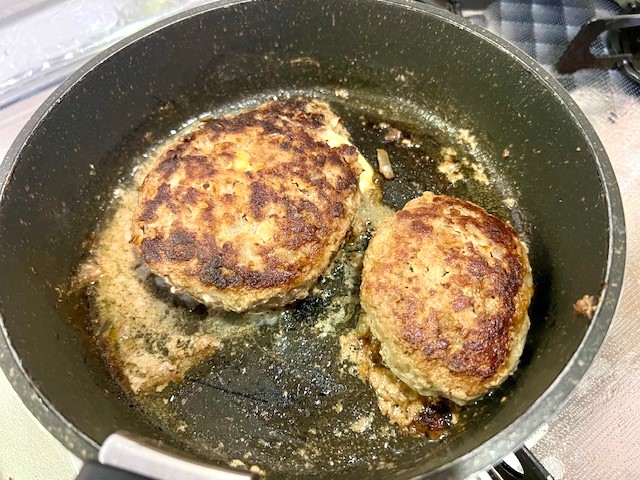 昨日作ってとっておいた『ハンバーグ』焼いて・・・