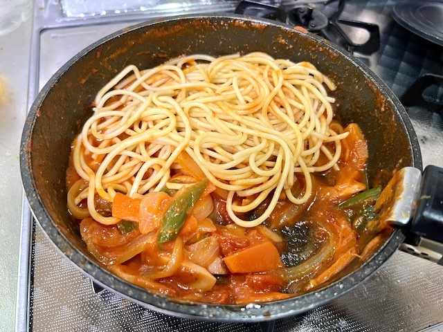茹でたスパゲティー入れて軽く炒めて