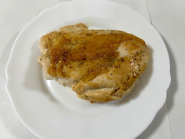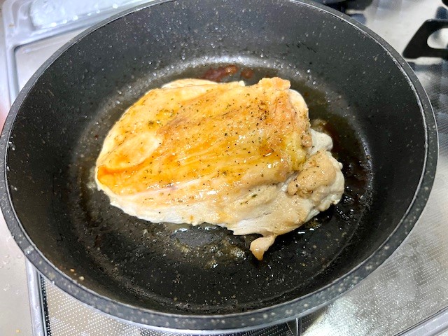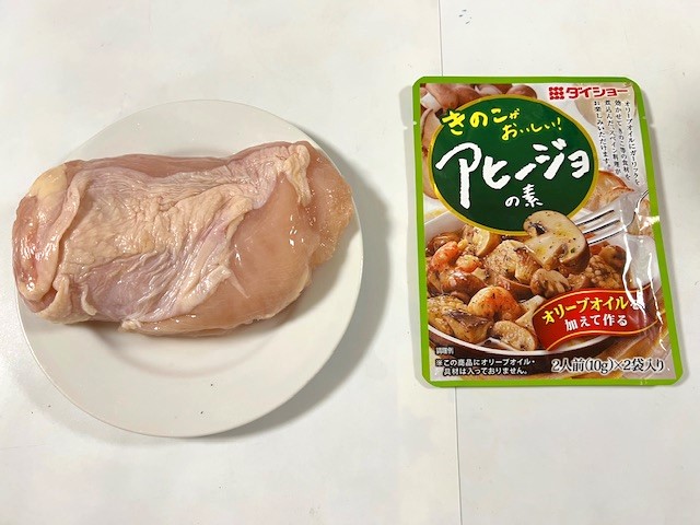 「鳥むね肉」に「アヒージョの素」をふってフライパンで焼いただけ