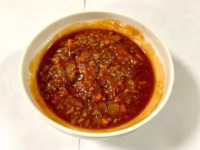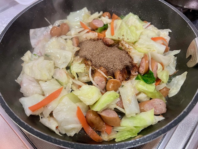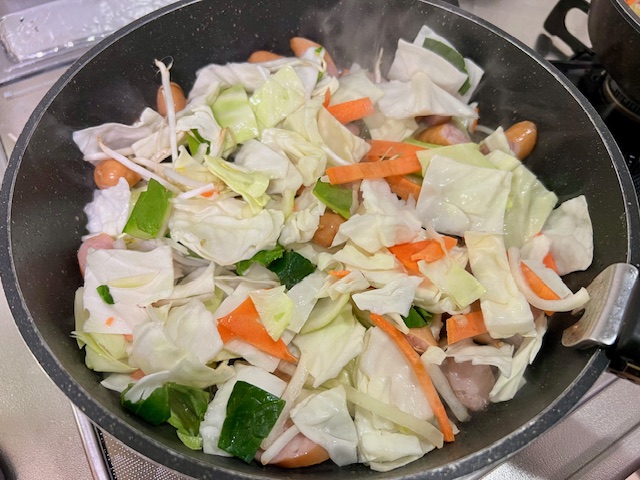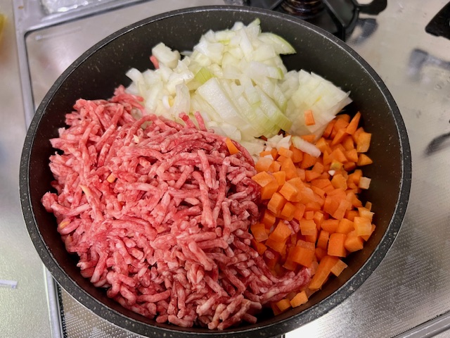 さっき作っておいた「ひき肉&玉ねぎ&にんじん炒め」と