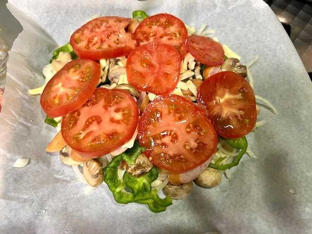 玉ねぎ・ピーマン・ウインナー・とろけるチーズ・トマトをのせて