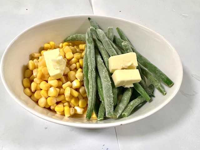 コーン・いんげんはバターをのせてレンジで”チン!”