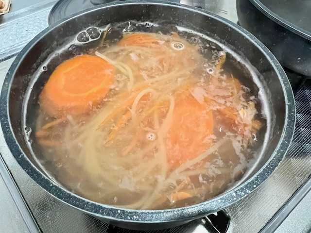 一緒に付け合わせ用と千切りのにんじんも時間差で茹でて