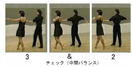 ルンバのニューヨークの重要なポイントとしてチェックがあります。 ニューヨーク : チェック・フロム・オープン・CPP・アンド・PP *CPP (カウンター・プロムナード・ポジション) *PP (プロムナード・ポジション) その名前の通り、チェックを行います。チェックのタイミングはカウント2と3の間の&カウントで中間バランス(両足に体重が掛かかります)を取ります。 チェック : 写真が示すとおり、前足を外に向けて、前足の膝の後ろに 後ろ足の膝がかかる状態で中間バランスを取ります。この時、 後ろ足の踵が上がります。中間バランスを取らないと戻る時に 遅れてしまいます。