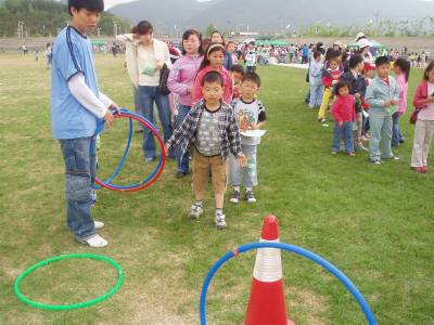 1日遅れで更新です。昨日は5月5日、韓国も日本も「こどもの日」でした。今年は「釈迦誕生日」も重なっていました。朝から今にでも雨が降りそうな空模様でした。今日は5時半には田んぼに出ていました。稲を植えたモッパンを田んぼに移す為にです。こどもの日にもかかわらず、イジャン(区長)は農水路の掃除の日に決めて、皆からブーイングです。今日は「こどもの日フェステイバル」に行くように、保育園の先生が電話がかかってきていました。ひろくんの絵が展示されていたからです。だから朝早くから仕事をするはめに。。。。。。500個のモッパンをトラックに移して、田んぼに持って行きます。途中サンチュン(シオモニの方の親戚)が手伝いに来てくれ、後でアジミ(サンチュンの奥さん)も手伝ってくれたので8時半くらいに終わりました。私は子供たちにご飯を食べさせ、旦那は掃除に行きました。準備をして、フェステバルの会場に。。。。。10時過ぎに行きましたが、もう会場には沢山の子供たちが集まっていました。受付で、プログラムをもらい、ゲームをするとシールを貼っていきます。シールを5つ以上集めて、最後まで残っているとプレゼントをもらえるようになっていました。輪投げバスケットボールのボウリング三輪車乗り、ビニールトンネル、フラフープ、など色々遊べるようになっていました。顔のペイント、カチューシャ作り、風船、シャボン玉などもありました。ひろくんの絵はいくら捜しても見つからず、諦めようとしていたのですがやっと見つけました。風船の刀やら、顔には太極旗のペイントで楽しみました。最後までいれば赤いTシャツをもらえたようです。今年はワールドカップの年、2002年の時のように赤いTシャツをプレゼントにしたようです。プレゼントはもらえませんでしたが、楽しかったようです。昼食は5家族が集まって、焼肉パーテイをしました。先月末に引っ越した日本人ママの家です。大人が10人、子供が13人集まりました。庭が広くて、庭で焼肉を食べました。子供は子供同士、アッパはアッパ同士、オンマはオンマ同士。それぞれが集まって、ぺちゃくちゃ、ぺちゃくちゃ!!楽しい時間でした。