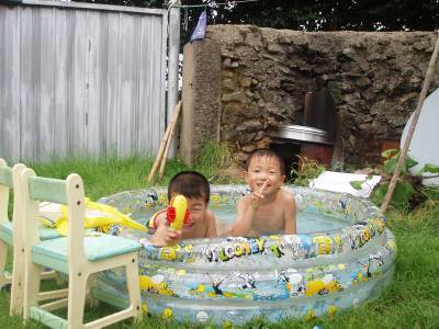 ここは昨日から暑くなりました。ソウルやカンウォン道は梅雨前線の影響で大雨のようです。全羅南道は梅雨明けしたかのような真夏日です。今日、長男はテッコンドーでプールに行きました。今日から保育園組みも夏休み。弟たちも行きたいけど、行けないからプールを出しました。午前中は暑かったのだけど、お昼からは太陽が出たり隠れたりしています。でも待ちきれなくてザブーン!!水はまだまだ冷たいのに。。。。。。1時間くらい待つと暖かくなるんだけど、「もういい?もういい?」と何度も聞くからもういいや!と言う感じで始めてしまいました。明日の夕方にはシヌイ(旦那の妹)一向がやってきます。団子が5人になります。明日からしばらくにぎやかになりそうです。日記も書けるかどうか?ですが又団子達の様子お届けします。