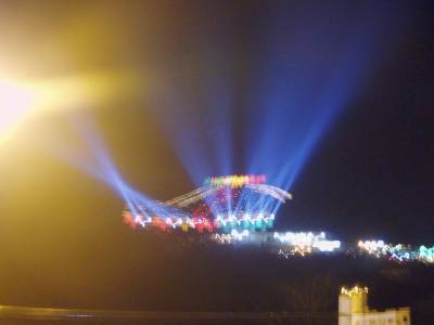 団子達の住むここから30分くらいの所に。「夏の香り」などのロケがあったポソンの茶畑がある。ここに大きなクリスマスツリーがあってかなり有名で、2月くらいまで見れるということで、夜団子達を連れて行って来ました。クリスマスにはかなり込んでいたようで、どんなのか?凄く期待していきました。韓国一という話。行ってみたらどこかな?と旦那と言いながら行ったのですが、あそこじゃないか?という所を見つけました。山に電気がパンチャンパンチャンしていて、山から空に向かってライトが3つも回っていました。もっと期待していただけに、旦那とこれだけ。。。。。ちょっとがっかりでした。でも夜景を見ようという車がひっきりなしに来ていました。「物好き」と思いながら見ていましたが、こういいながら来ている私達も一緒ですね~韓国は旧暦でお正月を祝う為、大晦日と言う感じではありませんが、2007年がいい年になればいいな~と思います。来年もよろしくお願いします。