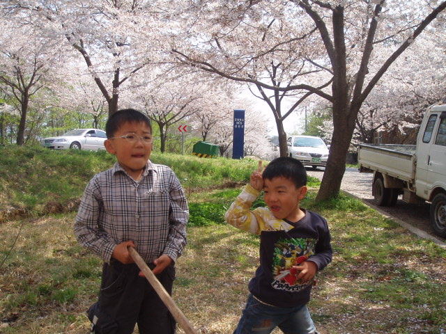 3兄弟の中でも育てるのが一番難しいのが次男。男ばかりの真ん中だからでしょうか?お兄ちゃんと喧嘩し、弟のものは横取り、年も近いせいかな~この間、作った通帳の中でも一番多かったのは次男。長男は一番多くもらっていたにもかかわらず、太っ腹でオンマのケーキも買ってくれました。次男はというと。。。。何処に行くのも次男は付いていきます。アッパが畑で仕事をしていても、山に仕事に行っても付いていきます。目ざとくて私でもアッパでも何処かに行こうものなら、駆けつけてきて一緒に出かけます。長男は面白くないからと言う理由、三男はテレビを見ているから。。。。そうやって付いていって、アッパが誰かにあったりすると「アンニョン、ハセヨ!!」とあいさつをする。韓国ではおじいさん、あばあさんなんかはよくおこずかいをくれたりします。1000ウォン(100円くらい)ですが。。。。それを知っているからか?一緒に行けばお菓子を買ってくれたりするからか?とにかく何処に行くのも付いていきます。先週はママさんバレーの練習にも付いていきました。これはその前の週に三男が付いていって次は自分が付いていくと言っていました。バレーに行くのには連れて行っても支障はありませんが、見ているだけなので面白くはないと思います。三男はこの間付いていって鼻かぜを引いたので次男がついていった日は月例回の日でした。私も初めてだったのですが。。。。今年に入って会長や総務が代わりました。そのためかもしれません、皆勤賞や簡単なプレゼントも準備されてありました。今月の会費の集金状況、支出の報告等あり練習後にはチキンとマッコリの準備がしてありました。この日、次男は監督からおこずかい3000ウォンをもらっていました。多分、1000ウォンずつ3人分だとしてくださったのだと思うのですが。。。。とにかく次男は懐が肥えました。次男も眠たくなっていたので、直ぐに帰ったのですがチキンは少し分けてくれました。こういう時、私はいつも次男に言います。「お兄ちゃんには内緒にしなさい!!」でも次男はお兄ちゃんに言ってしまうのです。いつもこういうことが原因で喧嘩が始まります。自慢したいのは分かるけど、1000ウォンずつ分けるのなら言ってもいいけど、あげもしないでもらった!と自慢するのは止めて欲しい!長男もいつも次男がおこずかいをもらってくるのを見ると、自分も付いていくということになりかねません。でもそうやって期待していくともらえない事のほうが多くて、長男は面白くないからです。すべての面において兄弟を同じようにする事は出来ません。こういうことは勉強面に生かしてくれるといいのに、、、、、と思う団子ママです。次男が一番気を使うし、難しいですね~子育ては何時までも勉強だし、これで良い!というものは無いような気がします。今日はアッパに付いていっている次男です。