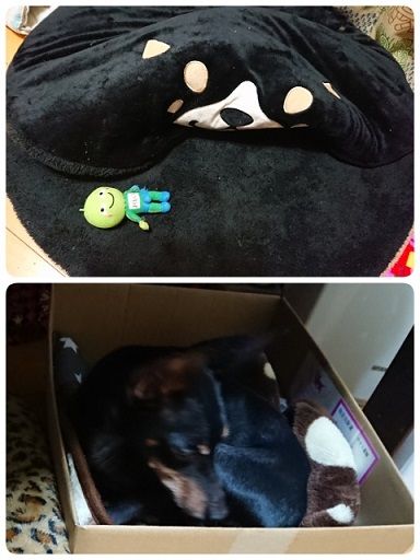 マースは段ボール箱ベッド。
