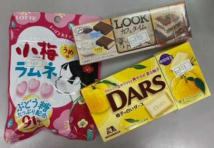 小梅ラムネ54円、カフェタイム70円、柚子のダース81円。