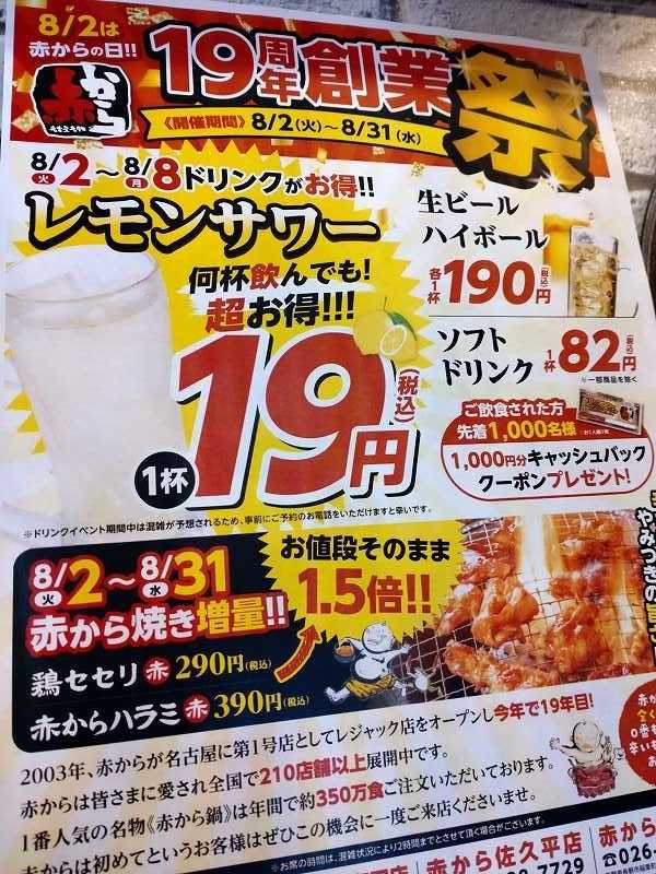 コロナ感染人数が長野市でも多いけど外食しないとストレスが溜まる旦那が水曜日休みになったので、私も少し早退してお店が開店した直後に入り1時間で帰れるところでないと怖くて外食出来ない。やきとり安さんに予約を入れたら「たまたま水曜日はテレビ取材で忙しい」と断られたじゃあ、チラシも入ったしご近所の「赤から」さんに5時に入店。お肉も1.5倍増量。下の写真は2人前。(でも1.5倍増量だから通常の3人前)せせり 2人前ハラミ 2人前生中 1杯レモンサワー 調子に乗って5杯旦那のドリンク 1杯ライス 中追加 せせり 2人前ミニいも娘(デザート) 1個合計 2803円安い!!寄った勢いでお会計の若い娘に「いやー悪いぐらい安いね」って言ったら「レモンサワー 1杯19円なので5杯飲んでも100円しないんですよ」また来て下さいと言われたから行くよ