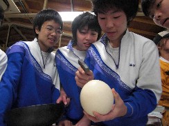 この間実習に来た中学生たちが作ったダチョウ卵を使ったプリン。今回はレンジを使って火を入れたのですが、しっかり火を入れた子は結構ちゃんと固まって美味しいプリンが出来ましたが、せっかちで早くレンジから出した子数人はプリンが固まらず、いつまで経っても液状でした^^;こういうのは性格出ますね(^_^)みんなにはいい経験になりました☆