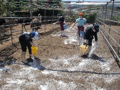今日は学生達にダチョウパドック内の「土壌消毒」をしてもらいました。前々から家畜保健所に「やった方がいい」と進められていましたので、学生の実習も兼ねて行いました^^しばらくこのままにして後に土を掘り返し、数ヶ月放置します。石灰を巻く事によって石灰が水分と反応して60℃以上熱を出して土を滅菌します。