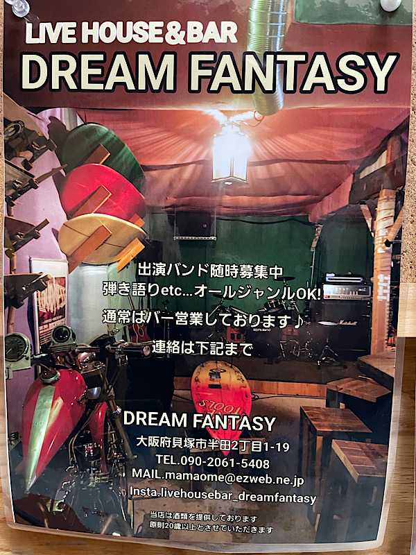 これは案外知っている人は少ないですが、実は貝塚市にもライブハウスがあるのです。先日JR東貝塚駅前にあるライブハウス「DREAM FANTASY」のオーナーさんが弊社「スタジオ0724」にわざわざ来られました。貝塚にライブハウスがあったというのを、私も3,4年前にインスタグラムで初めて知りました。まさか、地元貝塚に・・・と感じです(驚)。政治的に頑張っている泉佐野市とだんじりの町の岸和田市と学園都市の熊取町に挟まれ、貝塚市は長年どうもパッとせずに(何の特徴もない)人口が8万人を切るのも時間の問題という下降線の一途を辿っているところが地元貝塚ネイティブの私にとって何とも歯痒いですが、近隣の市に殆どないライブハウスが貝塚にあるのです。嬉しいじゃないですか・・・(涙)。弊社のようなリハーサルスタジオとライブハウスは一心同体・・・持ちつ持たれつの関係で、仲良く協業や提携することが音楽業界の発展に繋がります。コロナ期はライブ本数が激減したのに比例して、スタジオ利用客も激減しましたから。まぁ互いに協力して、泉州の音楽業界(バンド文化)を盛り上げていこう・・・という意気込みです。高槻のジャズストリートに対抗して、ジャズもやりますが貝塚が「ロックの町」・・・なんて呼ばれたら最高です。と言っても決して大袈裟ではなく、互いにフライヤーを持ち合い、互いのお客さんを紹介するだけです。これだけでも違い、一歩前進です。ライブハウスは文字通り練習結果の発表の場ですから、リハスタで練習してライブハウスが本番という事です。先日ラウドネスのライブに行きましたが、正に店名の「DREAM FANTASY」はラウドネスの曲から取ったそうで、何か縁を感じますねェ・・・オーナーは元プロミュージシャンだけあって、とにかく音楽業界のイロンナディープな話を聞かせていただいたり、驚くほど広い音楽業界のコネクションだったり・・・メチャメチャオモシロかったです。多分店でもそういう話でメチャメチャ盛り上がること間違いなし。まぁどんな小さな改革も、最初の一歩から始まります。最初の一歩を踏み出さないと、何も生まれません。そういう意味で、弊社「スタジオ0724」とDREAM FANTASYさんの出会いは第一歩です。弊社スタジオも会員数が3000人近くなり、会員さんがこの店でライブをして・・・スタジオもライブハウスも盛況になることを期待しています。とにかくバンドはライブをしてナンボ・・・の世界なので、是非ドリームファンタジーさんを叩き台にして世界に羽ばたいて欲しいと思います。これがスタジオ0724オーナーとしての切なる願いです。弊社のようなバンドスタジオもいくらキレイごとを言っても、結局は流行ってナンボ・・・の世界なので(汗)。そう・・・大がかりな設備投資をしてリハーサル(練習)スタジオを構えても、流行らなければ全くナンセンスなのです。という事で、オーナーと話していて、何か泉州の音楽業界(バンド文化)が貝塚を中心としてジワジワと盛り上がりそうな気がしてきました。とりあえず今週日曜日にはジャズライブがありますので、みなさん一度足を運んでみてください。「トランクルーム貝塚」「スタジオ0724」「 貝塚不動産.com」「貝塚卓球センター」「テレワーク&スタディ貝塚」 「貝塚名越パーキング」 大阪府貝塚市名越661 tel:072-446-0798 mail: info@sasatani.comにほんブログ村 にほんブログ村にほんブログ村 大阪府 ブログランキングへ