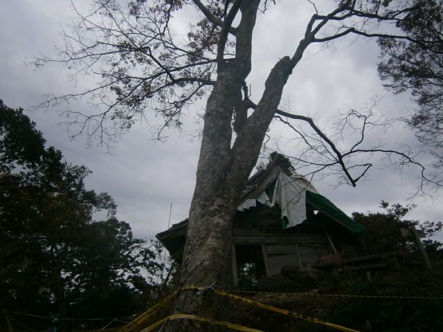下の画像本殿に向かって倒れ掛かった大木と背後が解体前の本殿です。