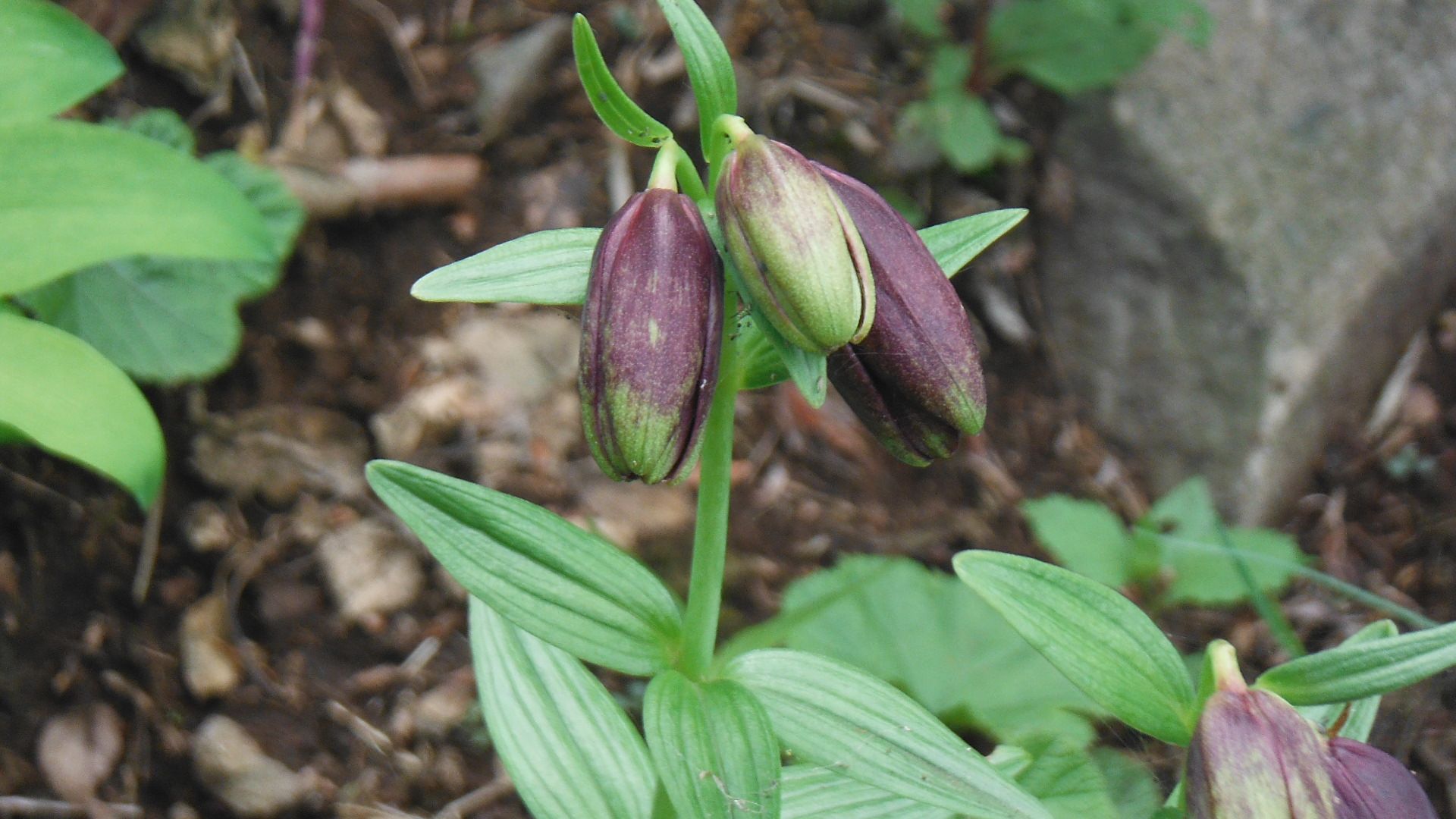 たまには愉快な話もしましょうね。下記に二つの画像を紹介します。上は恋の花のつぼみ状態で二枚目は開花した物です。撮影場所は連続紹介している文殊山の頂上にある本堂前広場です。本尊は「文殊菩薩」です。別に信仰に関係が無さそうな人が大挙して登ってきています。今年はコロナウイルス騒ぎで増えたことも否定できません。色々理由が有ります。北陸新幹線がこの山をトンネルで抜けます。北陸高速自動車道も短いがトンネルで抜けます。福井市南部に有り独標の文殊山は展望に優れています。有名な山には神社・仏閣が伴っています。ここ文殊山には真言宗の楞厳寺が管理している、施設が有り小文殊に室堂・大文殊に本堂・さらに次の嶺には奥の院が建立されています。ここは標高365mで高山とは言えません、なのに高山植物の「白山黒百合」が3株咲いていました。多分誰かが白山から無断で持ち帰って植えたのでしょう。この山に常時登る人は多くの登山を経験した人です(デコもその一人)。「黒百合は恋の花、愛する人に捧げれば、二人はきっと結ばれる」は有名な歌の文句です。今年増えた若い人に呼び掛けているようで、人気者になっています。この夏熱中症に成らないか、心配ですが、この悪戯見る人を楽しませてくれています。他にも紹介しいないが珍しいものが持ち込まれています。下の画像は「黒百合の花」が咲いた状態です。文殊山では多くの種類の鳥や昆虫・植物が見られます。デコちゃんには2年後に福井駅を出た北陸新幹線がこの山に隠れる姿を見るのが楽しみです。勿論別の展望台からは文殊山(福井トンネル)を抜けて鯖江トンネルへ向かう姿も見られます。笑われるかもしれませんが「何もない福井県」にとって、夢のような話です。