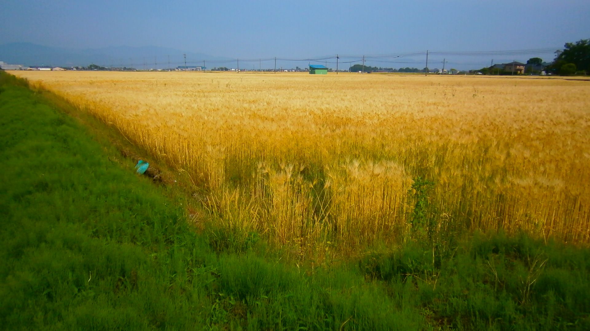 皆様方コロナ騒ぎで体調が狂っていませんか?「都会では季節が解らない」と言われますが、何もない福井県は季節の変化を楽しむには良い所だと思う。画像は収穫期を迎えた麦畑です。「誰かさんと誰かさんが麦畑(^^♪・・・・・」麦畑は水が張られていません。本当の秋を迎えると米の穂が実って黄金色に見える。今の黄金色は麦畑です。黄金色を見ると秋を連想しても、許される。恋人同士が座ればロマンスのバケーションです。この時期は邪魔された雲雀が垂直に青空へ上がっていく風景が見られます。デコチャンにも青春を謳歌した時代が有ったか?半分認知症で覚えていない。当時の女性も今は皺の芸術を自慢している。デコちゃんが毎日登山で利用している文殊山から福井市南部を見下ろした景色です。頂上の壊れかけた本殿の前です(今は解体工事中)。皆さん決まってスマホでパチパチやって帰られます。都会と違い動きは遅いですが、静かに~~~変わっています。御覧のようにまだら模様が青緑が増えてきている。田植えが進んでいる証拠です、緑に代わると黄色い模様は見られ無くなります。福井県の麦は6条麦です、麦茶に成るようです。他に変わるのが北陸新幹線の軌道ゆっくりしたスピードで繋がって行くことです。上部が福井市街地です、左の森が公園化した足羽山で左端にデコちゃんの家が有ります。町内には出雲大社福井別院と福井温泉(ゆ~遊)があり、賑やかです。中央より左に走るのが国8号線・まっすぐ伸びて下へ消えるのが工事中の北陸新幹線。右から左の交差して走るのは北陸自動車道、右に目をやると雪が解けかけた白山が見える。