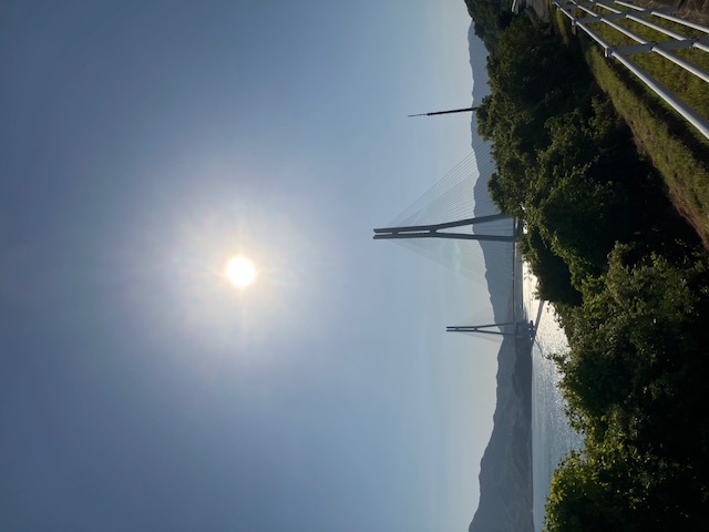 今朝は雨模様で、昼からは晴天!昨日の暑さは何だったのでしょうか?半袖で過ごせた!散歩で県をまたぐ?これはあることの後の話になりますとりあえずは歩いた距離は3キロぐらいなのです歩いた場所は多々羅大橋 愛媛県と広島県にまたがっている橋向こうが愛媛県!実は朝から車で走りっぱなしなのですが・・・・・その話は次回からとりあえずは歩いてみるかと?車は広島に置いて、歩きで愛媛に行ってから帰ってくる?向こう側が愛媛県なのです要はこの橋を往復するってこと(笑この橋 片道1.5キロ しまなみの橋は全て歩く事ができるので・・・・此処が県境右足が広島で左足は愛媛となります(笑よもや、こんな散歩になろうとは(笑橋の上ですれ違った夫婦は逆方向から散歩していましたねぇ数人は自転車で!さらに見た光景は外国人の女性一人大きなリュックを抱えて、あの橋を渡ろうと歩き出したあのリュックにはテント、シュラフなどが?そんな感じに見えましたいやぁ、たくましい!ひょっとして尾道から歩いてきたのかも?オマケ多々羅の鳴き龍?これでパン、パンと叩くとその音が、橋にあたって共鳴するってことです(笑本題はこれから、これから・・・・・続く