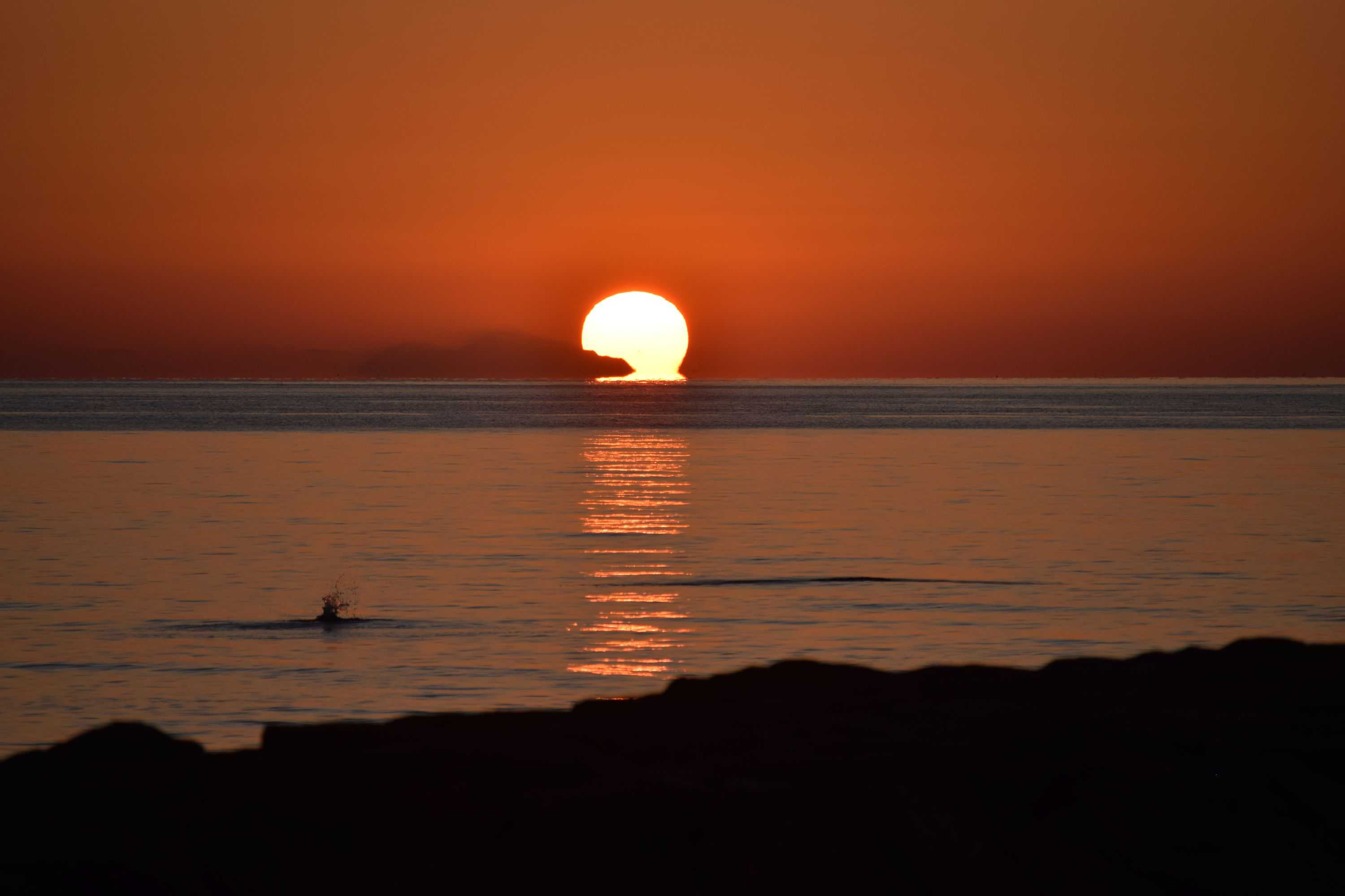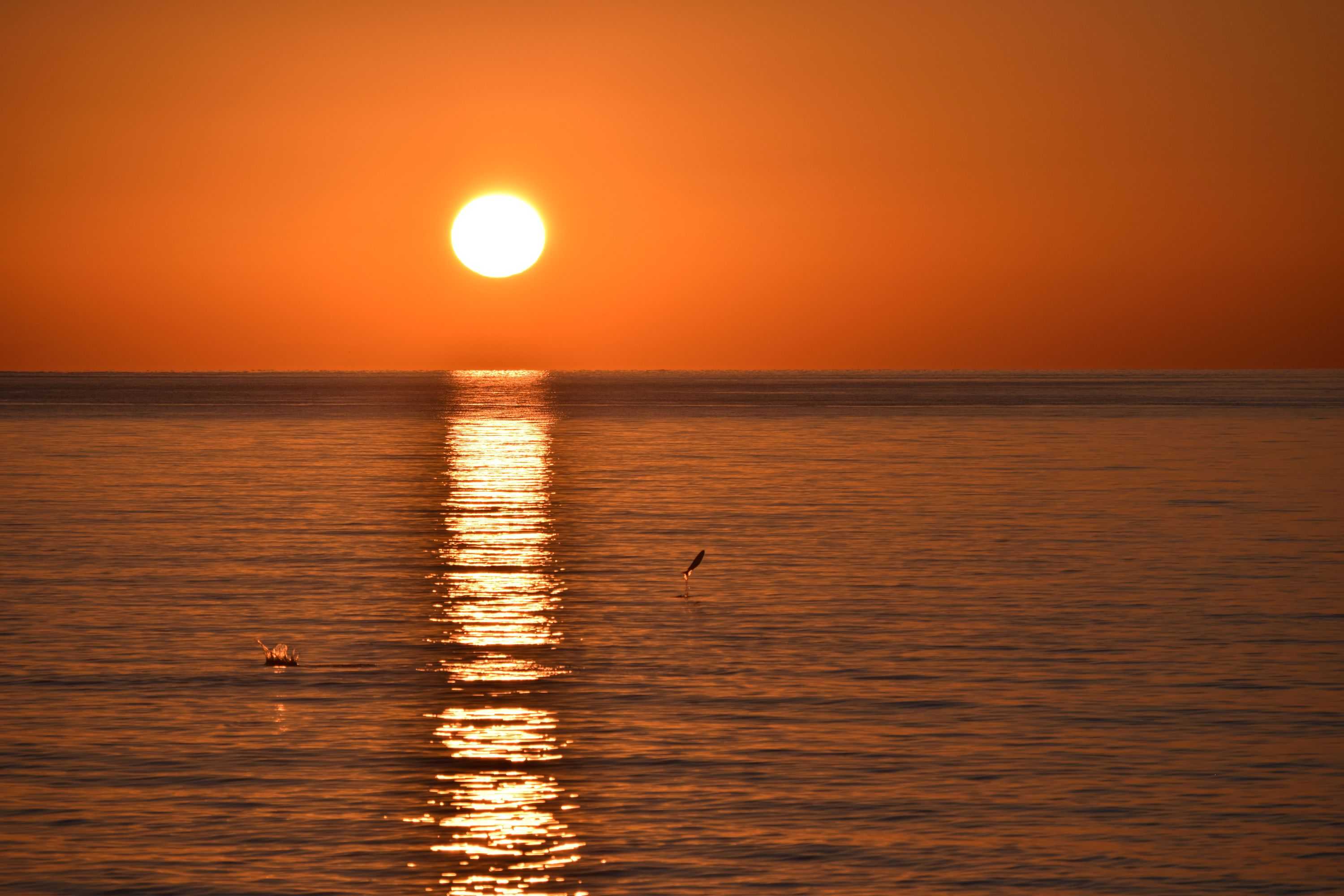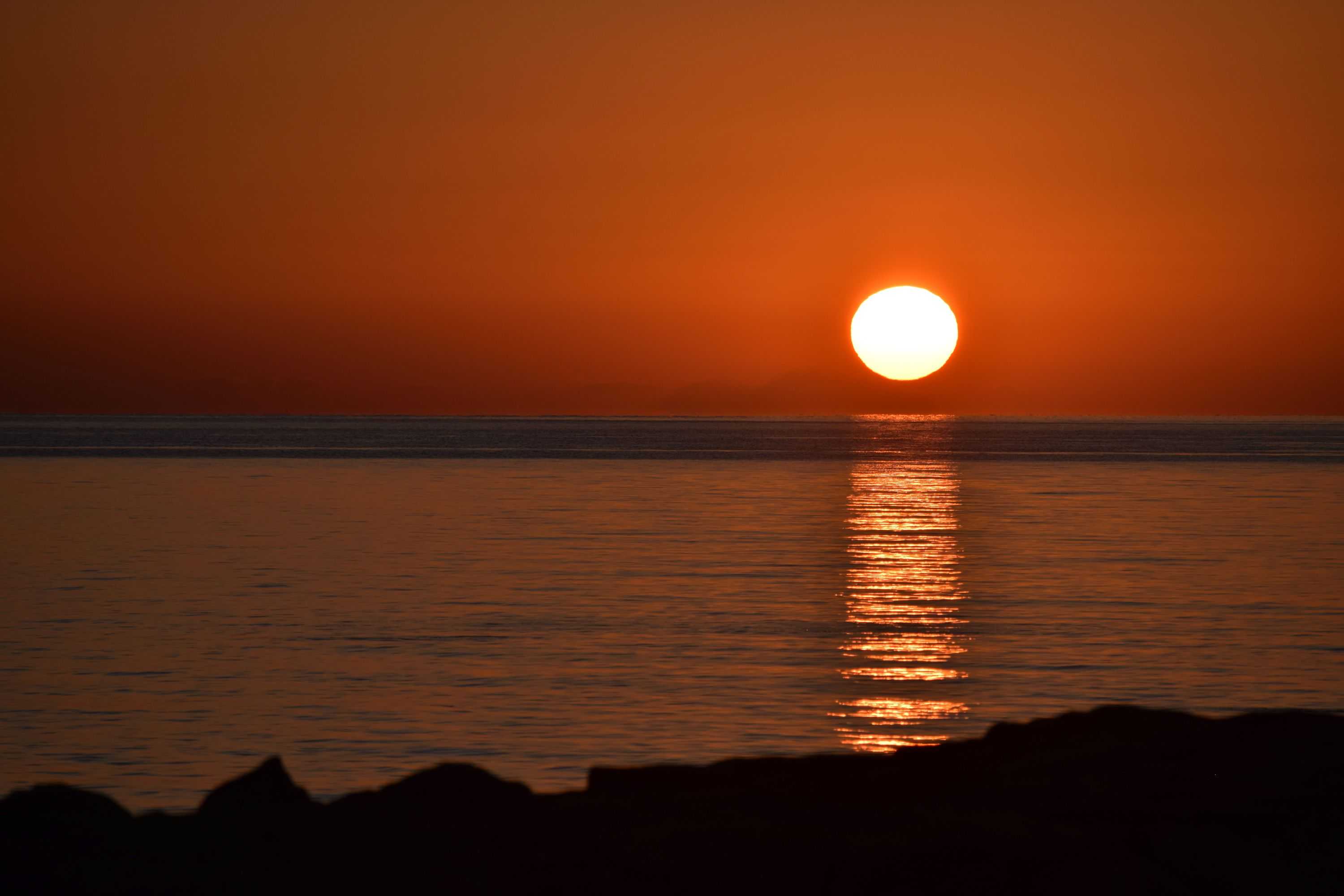 夕日が沈む瞬間の、海に道ができてる写真が良いですね。