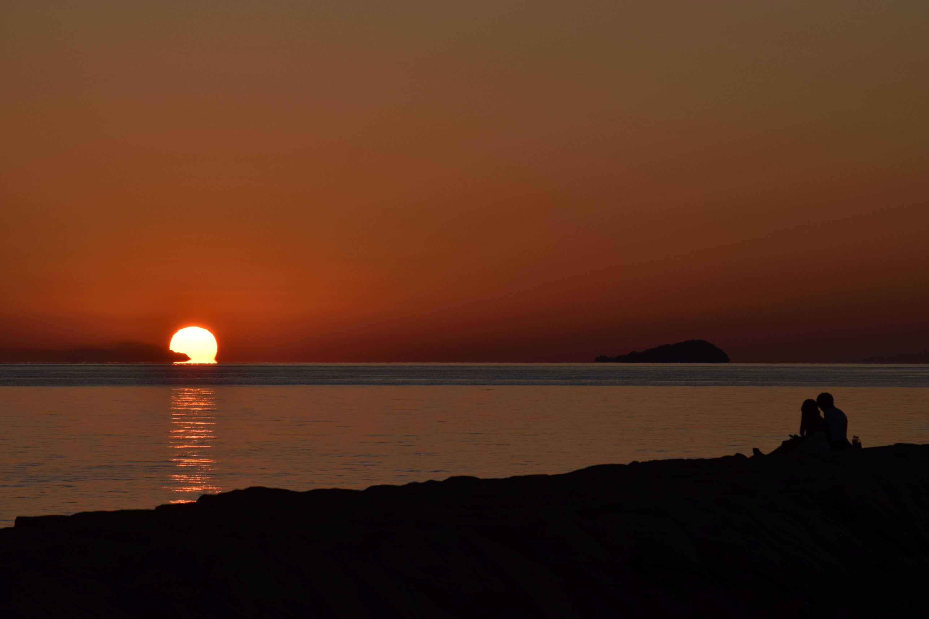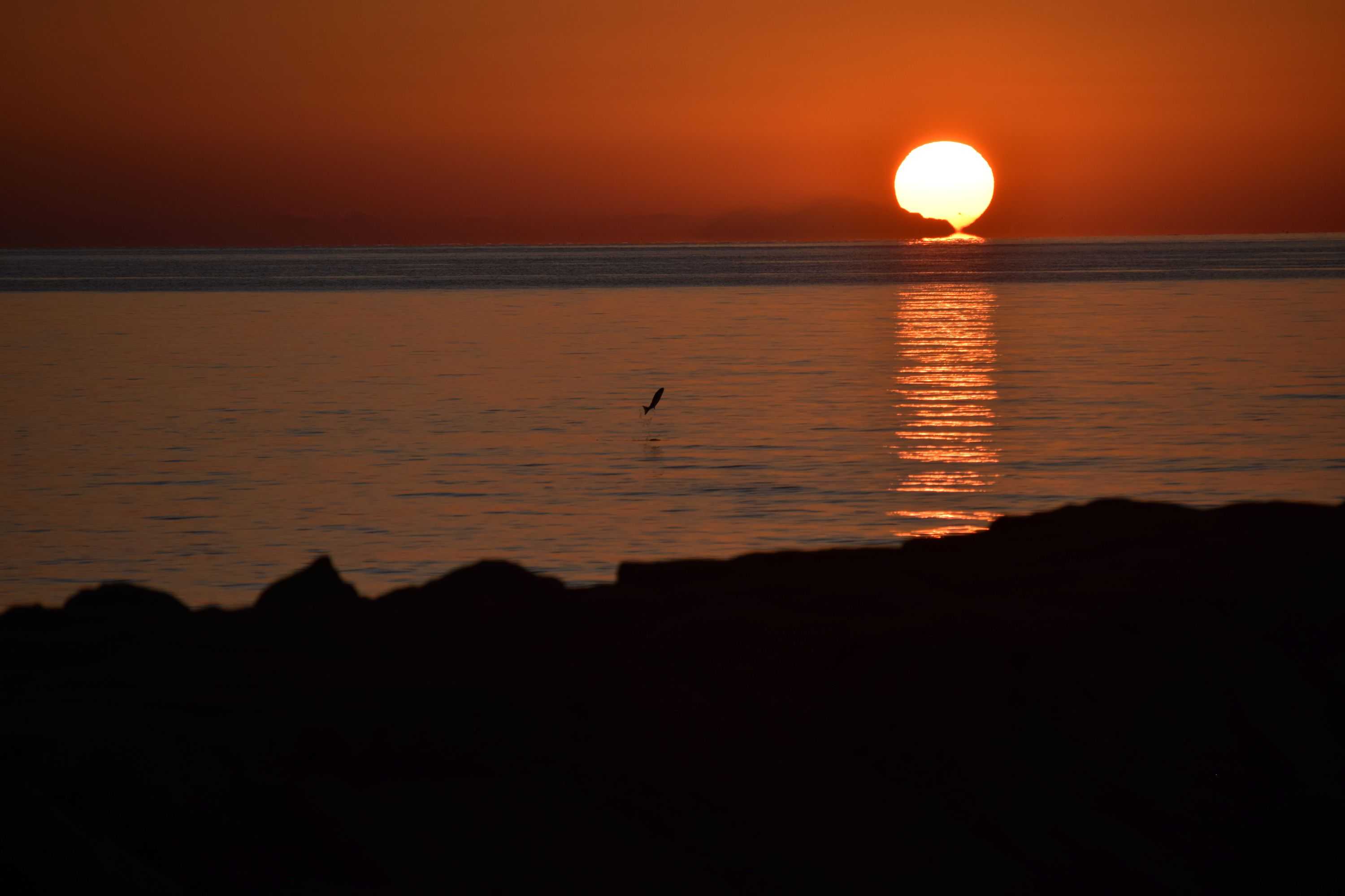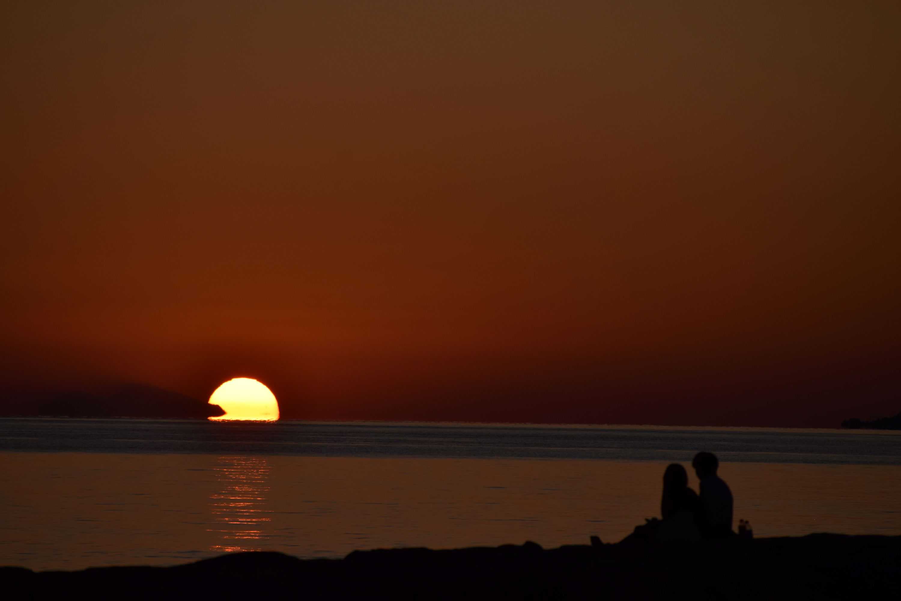 夕日が沈む瞬間の、海に道ができてる写真が良いですね。