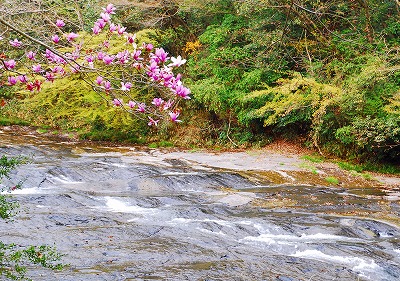 4月15日 「曇り」フラワーヒルでのお散歩も終了ちょっと、遅めの昼食(古民家風の炭火焼失敗でした)3人(私&yukaちゃん&ばーば)でブチブチ言いながら大分方面の帰りによく寄り道する遊水峡へキャンプや喫茶店で、よく利用してますキャンプサイトのすぐ横には綺麗な清流も♪マイナスイオン全開ですもちろんワンコ OK (テラス席)川沿いに、遊歩道もあり、遊歩道終点には、これまたマイナスイオン全開の「カッパ滝」なるものもそこまで、たどり着くには、そうとうな試練が・・・2004年10月の画像ですが、ビショビショです今回も、清流の魔の手に落ちそうな二人が・・・(アル坊は落ちてます) 『 アル坊!!野性に返る 』「鮭がいるでアルよ~」「タイミングが大事でアルね!!」「パッシャ」「クソー もう一回チャレンジでアル」「パシャ」「取れないでアル~」「やっぱり自然は厳しいでアル」『帰って「ばーば」のお花を食ってやるでアル~』家ではペットボトルからしか出てこない、大好きなお水が無尽蔵に流れてくる様に、ビックリなアル坊でした~(^◇^)/ぎゃはは