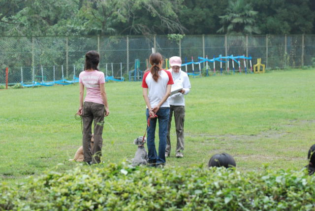 本日はNPO法人OPDESのチームテストを受験しに言ってきました朝7:30に受付開始なのでランランフィールドに6:30集合ですと言う事は、アレやらコレやらの用意で起床は5:30会場は福岡県甘木市の青雲ドッグスクール朝から小雨まじりのお天気ですが頑張っていきましょ~7:30会場に到着取り合えず、空き地で練習練習ん~もっとここを強化せねばとか何とか考えてたらいきなり 『パァーーン』 何ですか米を守る為の空砲のようです。あれまだ田植えしたばっかりだよねデニは大丈夫だけどレノさんが心配ですな~んて、思ってたら試験開始です今回は珍しくデニくんが先に受験2頭ずつのペアーでの試験、ランランチームのチッチとペアーですチッチが脚側行進やってる横での「伏せて待つ」の試験ですキョロキョロしながらも何とかクリア~さーデニくんの脚側行進ですリード付で40~50歩常歩で直進です(ナビ風に)その場で反転ターン、で10歩常歩です早足で10歩、ゆっくり10歩、常歩10歩で右折です10歩常歩で右折です20歩常歩で反転ターンです10歩進んで無言の「スワレ」です10歩進んで左折です10歩進んで群集8の字行進で目的地付近に到着しましたまたスタートラインに戻り「スワレマテ」で30歩離れて1拍おいて帰ってくるそのまま「ふせ」をかけて30歩離れて「コイ」で呼び寄せで終了終始、掃除機状態のデニくん、更に群集歩行前にストライキその他は無難にこなしました続いて、ハーブ&レノちゃんペアーですく( ̄△ ̄)ノガンバレェェェ!!緊張してま~すハーブの脚側行進スタートですハーブの試験中ず~と「マテ」です次は、レノ&yukaちゃんの出番ですよ~チョットブレてますが脚側行進&ジャッジ1枚目は「フセマテ」中のレノ2枚目は「フセ~呼び寄せ」3枚目は評価中なんですが、何でこっちむいてんのやっぱりレノちゃんは空砲にやられました・・・しかし 合格よかった~ ☆おまけ☆鼻でリラックス試験終了後、みんなが遊んでたプールにハーブが参戦気持ち良いぜ~(チョイ悪親父)我が家のレノちゃんの泳ぎも見せてやれ溺れてないですか助かったでつ 死ぬかと思ったでつよハーブ:「内緒にしとくけどもしかしてカナズチ」レノちゃんはカナズチなのか?いや、逃げ帰ってくる時は泳げてましたよ歩いたり、走ったり、泳いだりと大忙しの休日でした