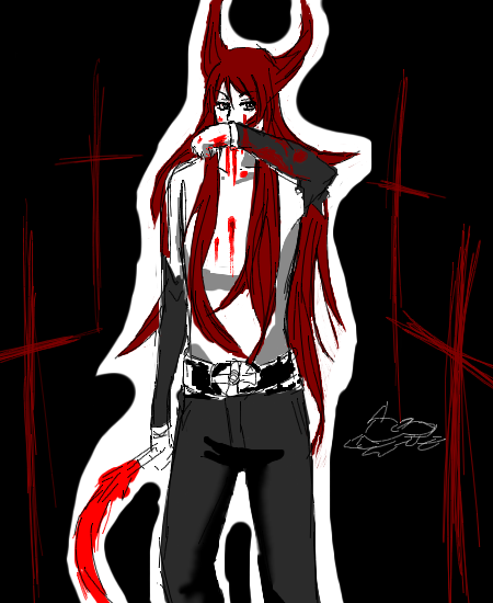 真面目もとい不真面目に書いた男の悪魔さんです白いのはコボルトですイメージは悪魔スキル・ブラッディクロス発動時のものあれ、敵に与えたダメージ分HPを回復するというものなのですがようするに血飲んでるみたいなもんですか?(ぁそんな勝手な妄想により出来上がった絵です上半身裸は自重すべきかもしれませんが大事な部分は髪の毛で隠してます((蹴さて、ネタというものがないのでここで終了ですどーも見てくださってありがとうございました