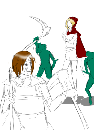 お題ランサ(チョコ○ォさん)とテイマ(ナイトさんのサブテイマ)を書いて(ウェアゴの鎌に指されるチョコ○ォさんをメインで)刺さってる人=チョコ○ォ(男ランサ) 命令出してる人=ナイトさん(ノーマルテイマ)雑。Pixiaで描きましたズームすると書きやすいので…でも線がブレブレでたまらんですあんまり時間かけると怒られてしまいそうなんで急いで描きました何故って、言われてすぐ実行に移したからです(笑でも言った人(ナイトさん)寝ちゃったみたいですが私的には雑ながらやりきったーという感じです色は気にしません(蹴実力的には50%も出せてませんが(100%はもっと雑w)いつか漫画載せるもんね!以上今日の日記でした