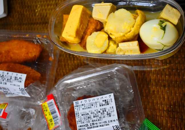 家で作ったオデン、腐らすわけにもいかないので、持ってきた。一応、A-COOPで補完するもの買ってきた夕食。 うわっ、おでん、恐ろしく不味くなっていた。