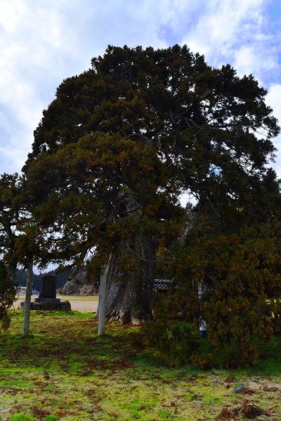 真言宗高照寺の門前にある老杉。樹齢900。杉の枝が地面を這うようにして逆さに垂れていることから、「倒さスギ」と呼ばれている。高さが約12m、幅が30m。
