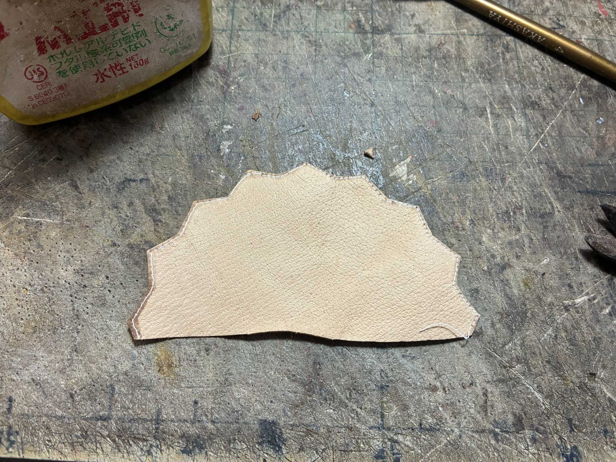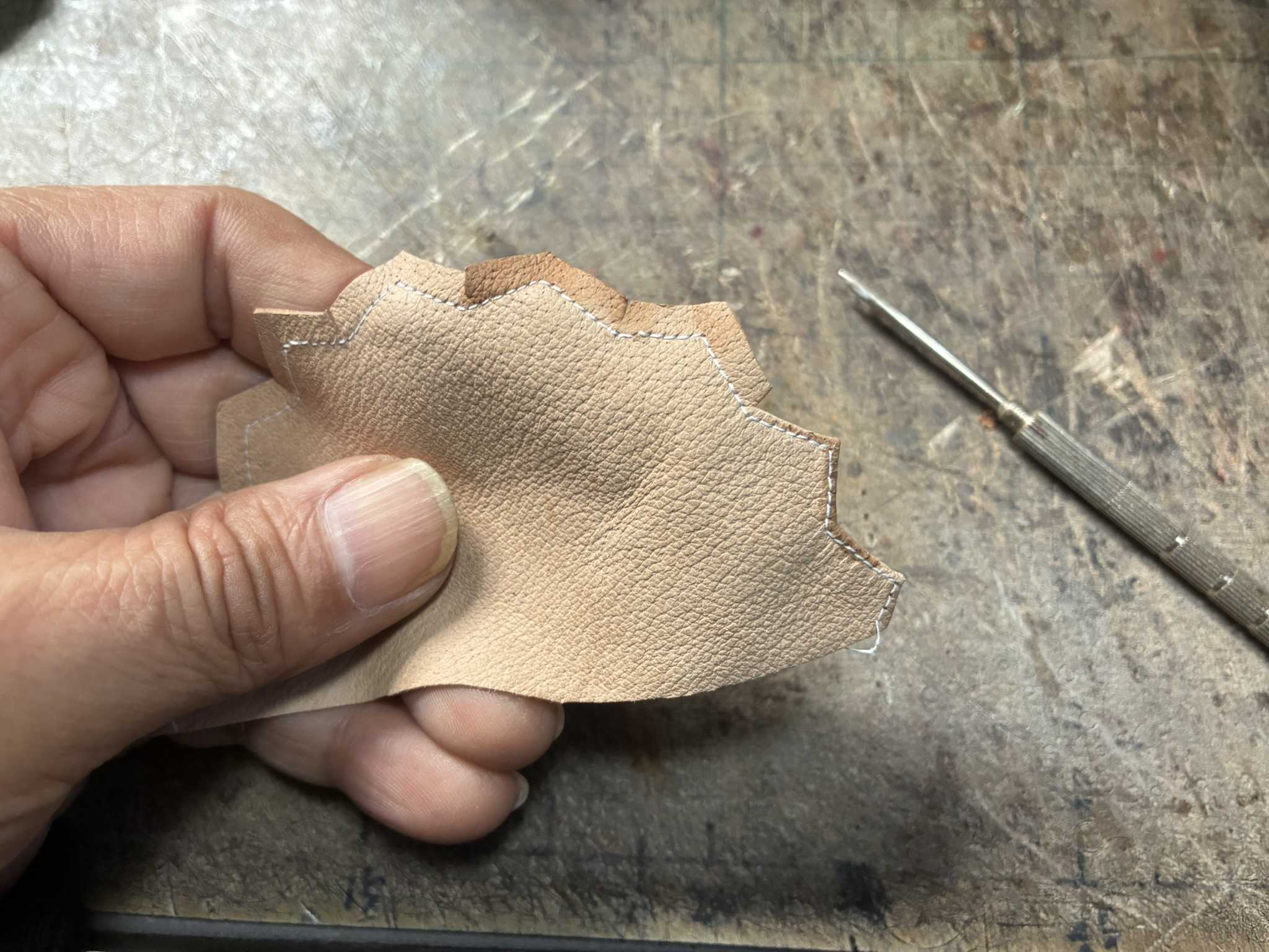 革に切れ目を入れ、右の端から折っていきます。