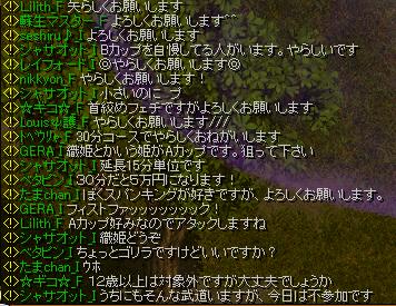 こんばんは!本日のGvは『エターナルフリーダム』様でした!集まりは2PT+武道陣の18名でした!初っ端からシフにMMMかけたら私が逝きました@@;ということでそのあと順調に狙われた感じであまりにもきつかったのでMMM没収し、チキンなひぃたんは普通にMMMで戦いました!その後もブロックがあれど何度も死にかけ得点を取ったり取られたりで最後3分ぐらいで逆転し、もう全員チキン逃走←怒られry火力さん満載でめちゃいたかったです><;結果です 『エターナルフリーダム』の皆様Gv対戦ありがとうございました!