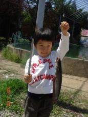 かなり久しぶりになってしまった日記の更新。え?先月は3回しか更新してなかったのね^^久しぶりに家族でおでかけした先週末。最初はオッパ(旦那)の会社の行事で魚釣り。 川や海での魚釣りではなく、釣りをする人&メウンタンを食べに来る人のために養殖しているところだったから、いっぱい魚もいて簡単に(?)釣れた。近くに鯉も養殖していて、子供達はえさをあげられるようになっていた。初めての経験に息子も娘もひたすらえさをあげ続けていたよ。 こんな庭も近くにあって、いい感じの音楽もかかっていてガーデンウェディングにいいんじゃない?なんて感じるくらいいい感じだったな~^^庭の横のレストラン?食堂?もいい感じなんだけど、きっとメニューはメウンタンだからウェディングはだめね^^私たちはオッパの会社の人とはあまり関わらずにゆったりとした時間を過ごせたので楽しかった~。その後は釣った魚で(?)メウンタン。でも魚を釣ったときから「この魚は一体なに?」という疑問でいっぱいだったんだよね。この魚でメウンンタンって聞いていたからね~。オッパに魚の名前を聞いたんだけど「メギ!」って。明らかにマートで売っている魚の名前じゃないわ~きっと私は食べたことない魚だな~なんて思いかなり不安だった。味は・・・まあ食べられた^^あまりおいしいとは言えないけど、スープの味はおいしかったし臭みもなかった・・・。家に帰ってきて速攻辞書で「メギ」を調べたよ。「メギ」とは!!!!!!「ナマズ」でした!!!!急に気持ち悪くなってきちゃって・・。私はきっと初めて食べたわ。韓国ではメウンタンにしてよく食べるみたいだけどね。まあ食べてしまったものはしょうがない・・・。 釣りとは関係ないけど、子供達は初めてひよこに触る機会もあって、自然を感じられるいい1日だったみたい。この釣りのあと、なぜかパジュの「英語村へ」。う~ん、期待が大きすぎたからいまいちだったかな?いろんなプログラムがあるみたいだから、子供が英語を勉強して少し話せるようになったら楽しいかもね。ちょっといいかもって思ったのはこんなの。たとえば「ベーカリーでクロワッサンを買ってきてください」っていうようなテスト。この「英語村」にはコンビニ、カフェ、ベーカリー、ファミレス、本屋などなどいろんな店があって、定員はすべて外国人。だからこんなテストも自分一人でベーカリーに行って、ちゃんと英語を使って買ってこれるかどうかってもの。これでレベルがどのくらいかって教えてくれるんだって。子供には楽しいかもね。うちは子供がまだ小さいからおもしろくなかったみたい。早く帰ろうよ~って言い続けてたよ。 「あ~赤い電車~」って言ってうれしがってけど、この他は魅力的ではなかったらしい。家族連れも多かったけど、英語の塾からバスを貸しきって来ている団体が多かった~。家族連れはオンマとアッパががんばって英語で話していたよ。でも結構話せるんじゃ?って家族も多くてびっくり。私たちはというと・・・数年前までは英語だった~なんてことを忘れるくらいだめ。英語を話すことがすっごく恥ずかしかったよ^^ハードな1日だったけど、久しぶりに遠くにおでかけ~ってことで楽しい1日だったな~。平日はアッパと顔を合わせる時間もない子供達。この日はアッパに甘えっぱなしだったね。またどこかへ連れて行って~^^