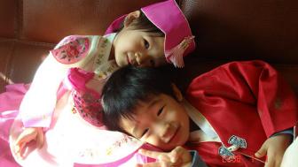 あけましておめでとうございます。この日記もかなりサボりがちですが、今年もちょこちょことソウルでの生活、子育てのこと、海外生活での愚痴(あまり書かないようにしているんだけどね)などなど・・・日記をつけていきたいと思っています。思えばソウルでの年末年始も今回で3回目。結婚をしてソウルに住み始めて、1度もお正月を日本で過ごしてないんだわ~って思うとちょっと、いやかなり悲しい(涙)。31日はまた今年も一人で紅白歌合戦の観賞。隣の部屋でオッパ(旦那)はTVを見ながらパソコン。「TV見てないんだったら消すよ~」と言うと「見てるって」って必ず言うんだけど、どうやってPCとTVを??っていつも思うよ。そしてシアボジ(義父)もまた違う部屋でまったく違うTVを見て年越し。紅白も「どうせ知らない歌手ばっかりなんだろうな~」と思ったんだけど、韓国のTV番組での年越しはどうもゆるせない・・・。紅白のトップバッター「モーニング娘。」「あ~よかった。私もわかるわ~」なんて思ったら、メンバーがぜんぜん違っていてまったく知らない顔ぶれだったわ(笑)。それでも半分くらいはわかる歌手だったかな?旦那さんを去年亡くしたドリカムの吉田美和ががんばって歌っている姿に感動したわ。若い歌手が出ると「生放送だから歌詞間違わないで歌えるといいね~」なんて心の中で思っている私って「もうすっかりおばさんだわ~」って思っちゃった^^お正月ってどんなときよりも一番日本で過ごしたいって思うのよね~。こたつに入ってみかん食べて家族で過ごす・・・どうってことないんだけどこれが一番落ち着くし「あ~今年ももう終わりか~」って1年を振り返るきっかけにもなるしね。韓国は旧正月だから休日も元旦だけでなんだか正月気分にもなれない。ほんとは旧正月の時にハンボkを着るんだけど、元旦にも着ちゃえ~ってことで「ハイ、ポーズ!」。最近まともなポーズもとらなくなった二人^^2008年。ねずみ年。今年の抱負は~と考えたんだけど・・・・。あまり大きなことを言ってもしょうがないので「1年間家族全員健康で過ごせるように妻としてママとしてできること、やるべきことをやる」と。そして「1日1回でいいので、子供と一緒に心の底から笑える瞬間を共有する」。笑うのってママにも子供にもすごく大事なんだって。1日1回くらい笑ってるだろう~って思うけど、思いっきり笑える瞬間ってそうないのかもな~って思ったりもして・・・。最後に2人目が生まれてからのこの2年間。ママとして生活してきた私。すべての愛は子供に注がれていた気がするのでね~。ちょっと子育ても落ち着いてきたのでオッパ(旦那)にも愛情を^^(笑)。努力します!!みなさま、今年もどうぞよろしくお願いします。