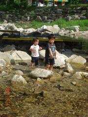 家族でサンジョンホス&渓谷へ。サンジョンホスは去年の6月にも行ったので、「アヒルのボートも乗らなくていい~」となんだか私たちも子供達もすぐに飽きてしまい、水を求めて渓谷へ。気がついたらカウォンドまで行ってしまって、帰りは渋滞に巻き込まれるしちょっと疲れたよ~^^ 川へ行く予定はなかったので、洋服の着替えもなく帰りの車の中はパンツなし(笑)。特に息子は大はしゃぎで「帰りたくない~」と泣き声だったよ。 おたまじゃくしや小さな魚もいたし、水もきれいで浅くて子供が遊ぶには最適の場所だった。人もほとんどいなかったしね~。ソウルではなかなか出来ない体験だから子供も楽しかったみたい。「もう2人で川遊びできるまで成長したんだ~」とまたまた息子と娘の成長を実感。 サンジョンホスの近くでご飯。二人でアッパのサングラスを取り合い「ハイ!ポーズ!!」。今週は水曜日も休日。でもちょっと疲れたから休養日かな。