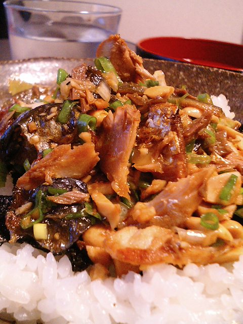 はい~今日の晩飯は「焼きさば飯」となっとりますぅ これは「上沼恵美子のおしゃべりクッキング」を偶然見たときにしてた料理です~ 生姜と醤油で味付けするんやけど今回はウマイこといって良かったサバの身ほぐし過ぎてちょっとどれがサバか分からんようになっちったけどぉ 実家に帰った時にオカンに作ってもらったんやけどあれはオカン好みで生姜がキツかったのであんまし好きじゃなかったんよ でも今日はエェ感じで仕上がってよかったよかった アドレス載せたかったけど無理やったわレシピは朝日放送の上沼恵美子のおしゃべりクッキングのHPで探してね~ いやぁ今週から学校始まったんやけどやっぱり学校に行っとる方がエェわテストとかは嫌いやけど暇じゃなくなったし友達ともワイワイ出来るし夏休みが終わってちと良かったて思ったん初めてやわホンマ