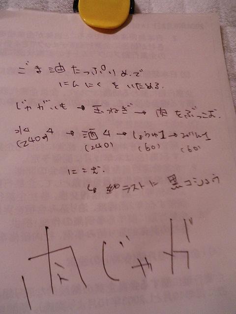 はぃ~今晩のおかずは肉じゃがと高野豆腐ですよ しかも・・・肉じゃがは・・・掃除しとったら出てきた何かの番組でしとったのをメモった方法で何の番組やったっけなぁ・・・ キューピー3分クッキングはなまるマーケット上沼えみこの料理番組魔法のレストラントミーズの腹ペコ亭 わからん けど、ニンニクとコショウが効いて美味しかったでぇ・・・コショウ入れ過ぎて辛かったけど・・・ っつう事でメモの通りに説明 ごま油たっぷりめでニンニクを炒める じゃがいも玉ねぎ肉をぶっこむ水4(240cc):酒4(240cc):しょう油1(60cc):みりん1(60cc)後は煮こむだけラストに黒コショウをお好みで ナスがあるからマーボーナス作る感じでじゃがいもがあったら肉じゃがって感じで作ってくださいな メモ 女の子みたいな字と最近言われる・・・そぉかぁあ ̄Д ̄?