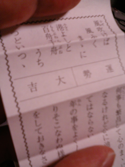 あけまして おめでとうございます≧Д≦ 今年もいろいろとあると思いますがよろしくお願いします んでもって今年の運勢は・・・ ピンボケしとるけど大吉だす~ v ̄▽ ̄vイェイイェイ 去年は吉で恋愛:ちょっと待ちなさい ちょっと待ちなさいて・・・ あの時は笑いコケたわ でも今年は・・・恋愛:自我を迎えれば大吉 ・Д・! 自分に素直にってことかな ってことで今年は就職やらなんやらすること多いんで更新も少ないかもしれませんが頑張っていくんでよろしくお願いします~
