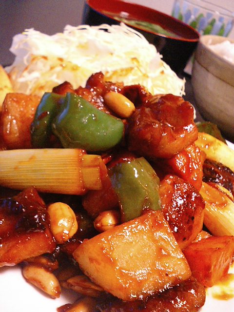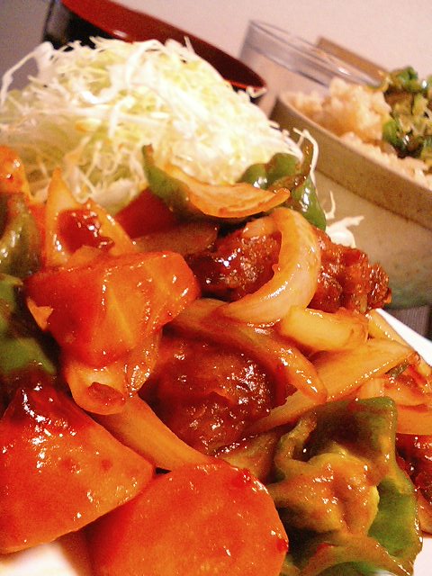 昨日の鶏のから揚げの残りを使って酢鶏を作ってみました~なんかテカテカして見にくいなぁ豆板醤もいれたからピリ辛で美味いで~ ん~( ̄m ̄;やっぱり暇やな・・・はよバイト探さなな
