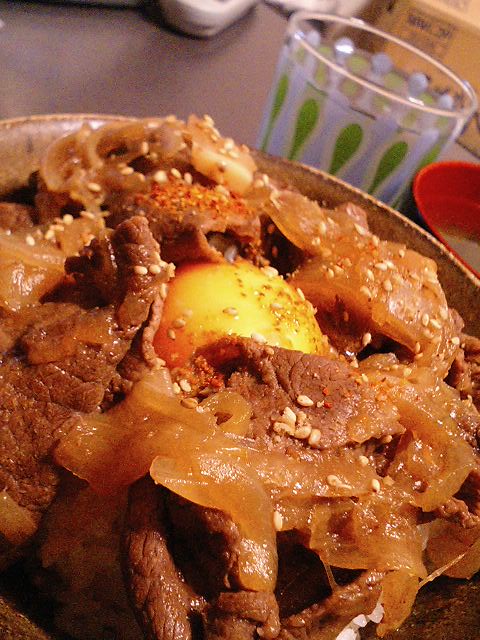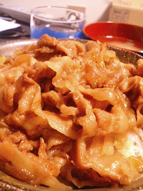 この前バイトの帰りによったスーパーで牛バラ肉100g98円やったこんなんみたら誰でも即買いやんなぁ~ってことでまたまた吉野家風牛丼~今回はバラ肉やからマジうま~レポート写しに来てた友達も「美味い美味い」ってよ~あっという間に半分食いあさりおった でも自分が作った料理を「美味い」とか「美味しい」って言われるのって 結構嬉しいもんやねますます料理が好きになったわさ~ 友達でこんなに嬉しかったんやから・・・彼女(おらんけど)に言われてみ オレ・・・昇天するかも・・・