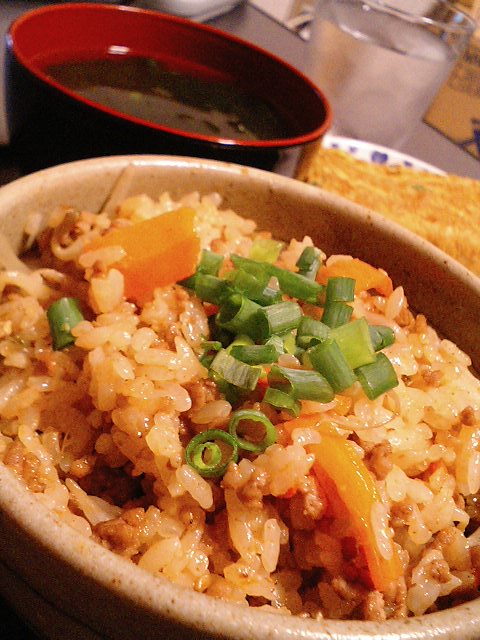 あぁ~ ̄▽ ̄美味い~ ビビンバ風炊き込みご飯ってやつですよぉ~ Birdさんのレシピ参考にして作ってみますた~イェイイェイhttp://plaza.rakuten.co.jp/aichan590929/diary/200609220001/#comment ご飯炊く時にもやし入れるん忘れたんやけどなんとか上手い事いったわ もりつけがね・・・ビビンバっぽくないんが残念やわ普通の炊き込みご飯やん・・・ まだまだやなオイラも これって・・・フライパンでカリカリにしたら・・・石焼ビビンバになる!?