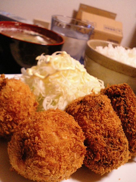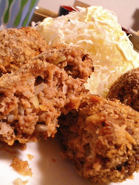 はぃ~・・・コロッケやでぇ~・・・ポン酢で食べてもイケるでぇ~ つうか・・・疲れたぁ ̄Д ̄; コロッケは・・・美味しいけど・・・作るのしんどいわ・・・ んで普通のコロッケやったら、オモんないんで半分だけ味付けてみてんえ~っと酒と醤油と砂糖で挽き肉と玉ねぎに味を付けました~ なんか「ふわっ~」っと最後のへんに味が来て美味しいで味は「すき焼き」っぽいんかなわからん~けど!!なんでか知らんけど玉ねぎが糸コンみたいになってんて!ホンマ!たぶん切りはずれた玉ねぎに味がよぉしゅんどったんやろね結構濃い目にしたからかな つうか・・・気分で形変えて作っとったからどれがどれか分からん