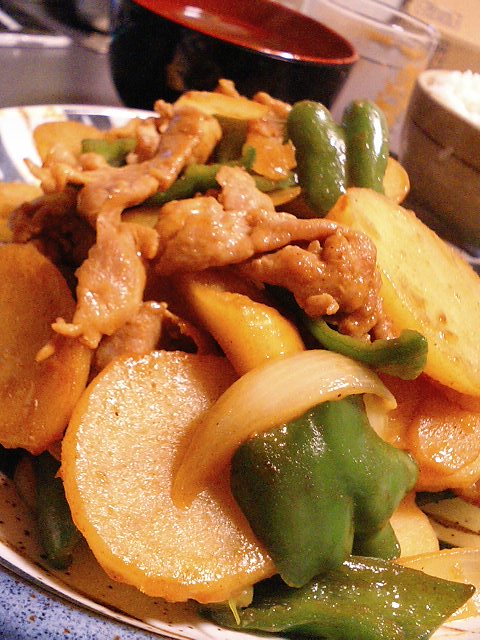 じゃがいもとピーマンのカレー炒め えぇ~っとこの前なんかのテレビでしとったんをとっさにとったメモで作った炒めモンです味付けぐらいしかメモってなかったから味付けの順番がアヤフヤしかもたしかコレは・・・ししとうで作ってたんやけどピーマンがあったから代返たぶんキューピー3分クッキングのはずなんやけど・・・ネットで調べてもなかったオレはどこで見たのぉ~!! んまぁエェんやけどね ̄Д ̄v