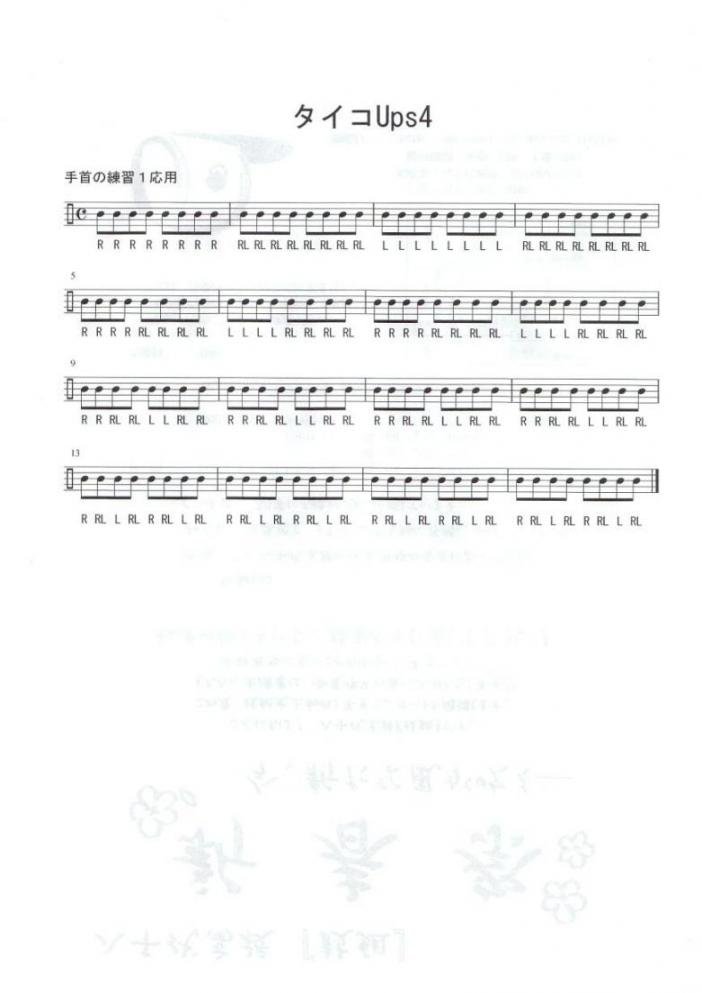 1.二人で練習用。 付点音符は4分音符と同じくフォルテ、フルストローク。 16分は5cmの高さから落とすのみでピアノで奏する。2.もう少し付点の長さを詰めて、右が入るギリギリ直前に「フラッ」と入れる。 ※同時に発音する練習もすること。3.左フラムの完成。4.この譜面は一人で奏する。上を右手、下を左手で。 最初は別々に練習する(特に左手)。 右手と同時に発音する箇所を少しだけ早く叩くとフラムになる。 どんな音が出るかは叩いてのお楽しみ。