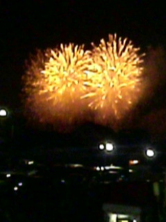 こんばんわ~昨日は5時過ぎから、2人で花火大会を見に行きました今年は打ち上げ会場から見るつもりだったのですが、ネットで調べると、噂通り、帰りは終電に間に合わなくなるかも知れないので、例年通り、1駅前で降りて 駅の側で見る事に・・・終るとすぐにに飛び乗ると、ギュウギュウ詰めに乗らなくて済むって魂胆で・・・7時からと思っていたので、駅の側のスーパーでお寿司や肴、を買って宴会を始めますがなかなか始まらない・・・(・・?)7:50にやっと始まりました。もうすでに2人は酔っ払い(^^;)私のウォークマン仕様携帯なのでまた、画像が悪いですがお許しを・・・これは2つの花火じゃなく、いくつもの花火が1度に打ち上げられています。ここの花火は、花火芸術と言って、世界一だそうです。色分けされていて、バランスも考えられていて、3、4箇所から上がります。「もうそんなにいっぱい上げなくていいやろ!」「勿体無いって!」「もうええって!」と思う程上がります。何万発だったっけ?・・・ちょっと忘れましたが、最後のスターマインだけで8000発と聞きました。火事じゃないです。綺麗に写りませんが、この真っ赤な後にこれ!スターマイインですが眩し過ぎて写りません( ̄▽ ̄;)もっともっといっぱい、デジカメで美しく撮ってお見せしたいです・・・変な画像でごめんなさいm(__)mこれが最後、すぐにに飛び乗り10時までに帰り着きました。よって、この後は居酒屋にGOなんぼ飲むねん!(^^;)飲みに行くのちょっと我慢してデジカメ買えよ!って話やけど・・・なぁ!でもいつも安い飲み方で2400円也・・・・・・で、まだ続きが・・・も行っちゃいました~なんぼ遊ぶねん!ってか?(≧∀≦)と言う訳で、昨日はよ~く遊んだ一日でした。チャンチャン♪