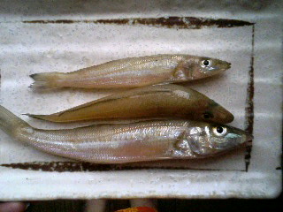 暑中お見舞い申し上げますこれって、秋が来るんやろか・・・暑いけど、頑張るしかないっか・・・大好きな釣りをする為に 頑張りましょう さあ、釣りババIN和歌山「砂浜のアハハ」もう一度頑張って書きますね!14日の夜、仕事が終ると、私は釣具屋さんへ、ダーリンはレンタカー屋さんへ行き、出発の準備完了11時、11時11分出発~1時到着、和歌山中紀なので、道も空いていたし早く着きました。まず、車を降りてビックリしたのが、空を見上げてそうだ、何とか流星群って言ってたね、それより この空は大阪では絶対に見れない美しさ・・・天の川がはっきり見えるのです時々流れ星がスーっと流れていきます。「いっぱいお願いできるね!」首がダルくなるまで空を見上げていました。さあ!釣りや、釣りやまずは漁港の方に車を止めていたのでここで釣りを始めます。ここは、初めて秋アオリを3匹ゲットしたポイントです。空だけじゃなく、海面もキラキラ光っている・・・夜光虫が幻想的何やら水面が騒がしい・・・バシャバシャ、バシャバシャ(・・?)「何やろね?」「このバシャバシャの正体釣ってやる!」浮き下1ヒロ、イソメをつけて・・・小サバでした。ウヨウヨいます。ダーリンは2匹釣ったところで、もうオネム・・・「おやすみぃ~」・・・・・( ̄▽ ̄;)私は小サバを4匹釣って、(もうサバはいらんわ)次にタナを3ヒロにして壁際を狙います。このコがつれました。ガシラ君です。いいサイズです。20cmありました。(フラッシュ明る過ぎ!白いガシラ?)次にマウスリンが気になってやってみる事に・・・どうやって使うんだろう・・・(・・?)私なりに、エギングロッドにセットして、まず表層、ちょっと沈ませて中層、ずーっと沈ませて底を探ってみた(つもり)けど、何もアタラないのでやんぴ(寝ようかな~ぁ・・・もったいない!!)何が居るか分からないので、タナをいろいろ変えながらやってみたけど、サバがウヨウヨしているからか?他は釣れない空が明るくなって来た・・・エギングやろ~っと何もアタラない・・・いない?あっちこっちウロウロしながら・・・釣れない・・・1人エギンガーさんがやって来た、「釣れますか?」私「ダメです、釣れないです」その人もしばらくして、移動して行きました。明るくなって見ると墨後が4箇所程ついていました。(誰か釣ったんや・・・いいな・・・)明るくなるにつれ、海の底がはっきり見えてきました。3ヒロちょっとの深さなのに今日は澄み過ぎ!5時半ダーリンを起こして、砂浜に移動、砂浜も底がはっきり見えてこんなんでした。わかりますガッチョ(メゴチ)が居ます。さあ!ダーリンがキス釣りに燃えます(^^;)おかげさんのおかげで、よく飛びます、飛びます!1投目、ガッチョ・・・2投目、ガッチョ・・・3投目、ガッチョ・・・私は横でちょい投げです。きっと足が届くか届かないか?って深さだと思います。グングン!!来た!!!巻いて巻いて~・・・「は~い、キスゲット~!」ダ「何で?何でそんな、ちょっとしか投げてないのに釣れるん?腹たつな~!それもええ型やし・・・」私「そんなん知らんやん、浅い所でもおるってことや!はよ釣りや!!」ダーリンは一生懸命に釣っています。・・・・が、また、ガッチョ、ダ「あ!ちょっとアタリ方が違う!」チャリコ(鯛の子5cm程)でした。ダ「もう!何で俺にはキスが釣れてくれへんの?」私「ウシシ」ガッチョも居ない年がありましたが、今年はガッチョだらけ・・・ガッチョは唐揚げが美味しいです。大きいのはお刺身にするとイケルらしいです。が、ヌルヌルを取るのが面倒なのと、棘に刺さると痛いので、リリースしていました。何匹釣れたか分からない程釣れました。私にフグが釣れました。ダ「俺、キス釣ってないけど、フグはまだ1回も釣ってないで!」私「そんな自慢してどないやねん!はよ、キス釣りや!」(`∀´)ψイヒヒダ「やっと来た~!キスや~!!!」私「ちっこい・・・」ダ「何で遠くに投げてこんなちっこいの?」その内、潮が引いてきます。私は後1匹追加しただけで、遠投のダーリンに利が・・・結局ダーリンは意地で?8匹釣りました。私は釣れなくなると、また浮き釣りでベラを3匹釣りました。お昼から2時間程 車でお昼寝をして、また釣りをするか、泳ぐか迷い、海水欲に来てる人が増えて来たのもあり、私達も潜りに行きました。ここはもうサザエは見当たらなくなったので、ウ二を取って、浜で割って食べました。売っているような大きなウ二は採れないので、本のわずかなウニを食べて、贅沢気分を味わいました。帰りは海南まで渋滞でしたが、1斜線になっていたので仕方ない・・・海南以降はスムーズに帰れました。写真、捌いてからになっちゃいました。キス11匹、ガシラ1匹、小サバ6匹、ベラ3匹で、ガッチョは大漁でした。キスは天婦羅、サバとガシラは煮付け、ベらは塩焼きで美味しくいただきました。これからは、月に1回は車借りて、遠征しようね!って事になりました。15日の釣行記はこれでおしまいじゃっ
